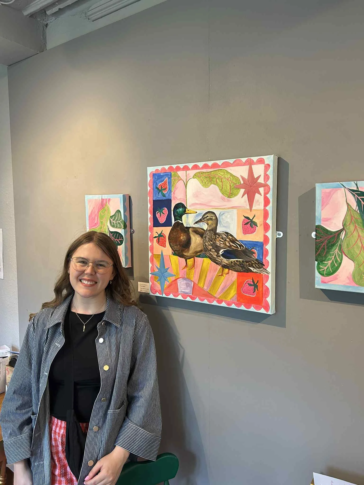 Emma Lou Andrews is a Caerphilly based artist. Her practice explores themes of joy and contentment, drawing inspiration from both indoor and outdoor spaces. Through the depiction of birds and fauna, combined with the gentle repetition of patterns inspired by quilts from her home, Emma explores the relationship between belonging and connection in the domestic and natural world.
